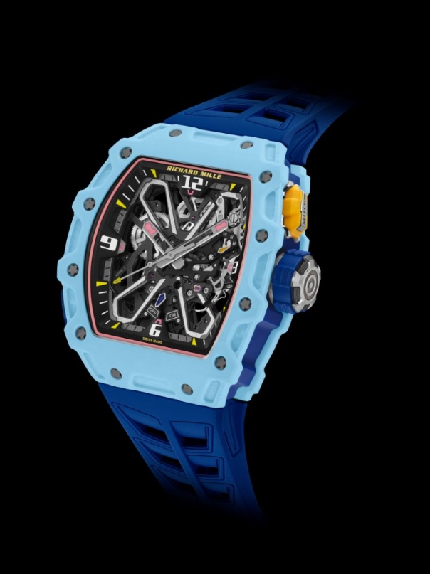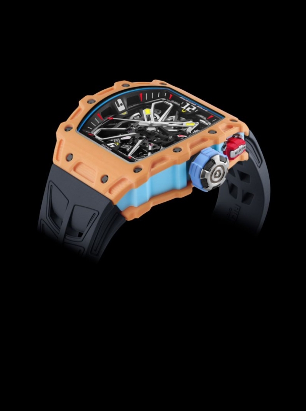 看似柔和的淡蓝与鲑鱼色,实则是RICHARDMILLE工艺难度最高的色彩之一,集中体现在RM35-03腕表上。淡蓝色的灵感源自爱琴海的晴空,为了避免色彩过于“轻浮”,团队在颜料中加入微量的云母颗粒,让蓝色透出细腻的珠光,同时通过控制纤维层的压力,让色调呈现出“近看是浅蓝,远看带灰调”的微妙变化;而鲑鱼色则需要精准平衡橘色与粉色的比例——过多的橘色会显得艳丽,过多的粉色则会过于柔和,最终通过12次工艺迭代,才确定了最接近鲑鱼腹部的暖粉色调。更重要的是,这两种色彩的QuartzTPT均保持了材质原有的抗冲击性能,真正实现了“柔美外观”与“强悍性能”的完美统一,恰如品牌“柔中带刚”的精神内核。