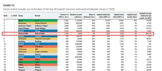 其次是“高单价”的价格中枢持续上移。在销量增长6.25%的背景下,品牌的总营业额却实现了13.6%的跨越式增长,其核心原因在于平均零售单价的提升。数据显示,RICHARD MILLE的平均零售单价从2024年的275,000瑞士法郎(约239万元人民币),增长至2025年的294,118瑞士法郎(约256万元人民币),涨幅达到6.95%。量价齐升的局面,直接推高了品牌的隐含零售额至17.5亿瑞士法郎(约153亿元人民币)。