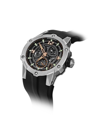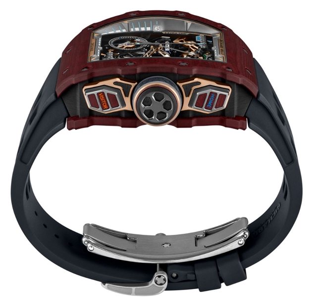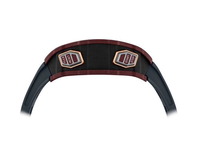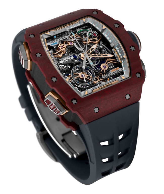 为了实现这一宏大的功能愿景,品牌与AudemarsPiguet leLocle合作,历时五年研发出了一款取得专利的全新陀飞轮飞返计时机芯。RM 41-01钛合金机芯集成了陀飞轮擒纵机构、70小时动力储存,以及配备重叠中央分针和秒针的飞返计时码表。